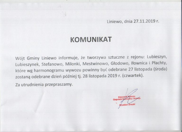 OGŁOSZENIE OTWARTEGO KONKURSU OFERT WÓJTA GMINY LINIEWO NA REALIZACJĘ ZADANIA PUBLICZNEGO W 2020 r. Z ZAKRESU POMOCY SPOŁECZNEJ