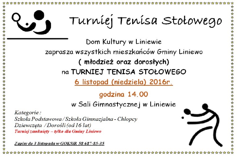 Gminy Ośrodek Sportu i Rekreacji w Liniewie był gospodarzem VII Turnieju o Grand Prix Pomorza w Skacie Sportowym. Uczestniczyło 44 skacistów w tym 3 Panie z całego okręgu Pomorsko- Kaszubskiego Polskiego Związku Skata Sportowego. Obecni byli gracze Klubów z Lipusza, Dziemian, Rumii, Redy,…