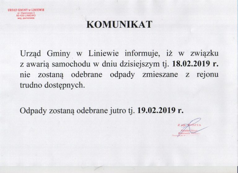 OGŁOSZENIE Gminny Ośrodek Pomocy Społecznej w Liniewie informuje, że w dniach od 19 do 20 lutego 2019 r. w godz. od 9.00 do 13.00 w świetlicy wiejskiej w Orlu będzie wydawana żywność w ramach Programu Operacyjnego Pomoc Żywnościowa 2014-2020