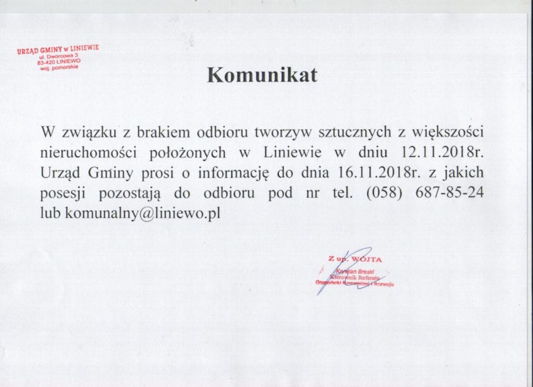 Gminny Ośrodek Pomocy Społecznej w Liniewie informuje, że w dniach od 22 do 23 listopada 2018 r. w godz. od 9.00 do 13.00 w świetlicy wiejskiej w Orlu