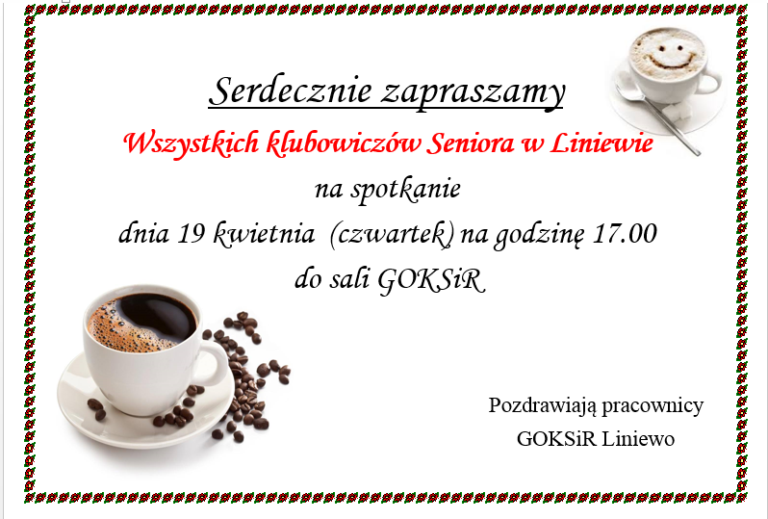 Dnia 6 kwietnia 2018 r. o godzinie 12°° na Sali Gminnego Ośrodka Kultury Sportu i Rekreacji w Liniewie, ul. Dworcowa 3 odbędą się warsztaty dietetyczne, kulinarne, niemarnowania żywności. Zapraszamy wszystkie osoby objęte programem PO PŻ. Udział w kursie jest bezpłatny. Program Operacyjny Pomoc…