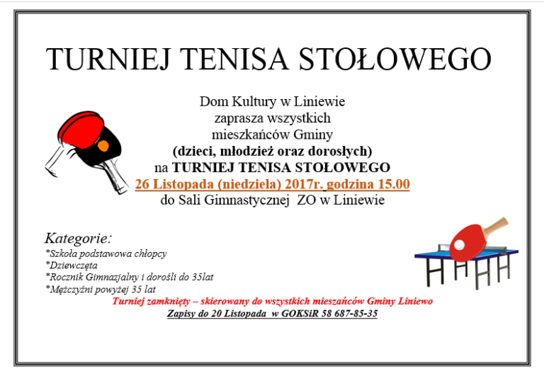 OGŁOSZENIE Gminny Ośrodek Pomocy Społecznej w Liniewie informuje, że w dniach od 25 do 26 października 2017 r. w godz. od 9.00 do 13.00 w świetlicy wiejskiej w Orlu